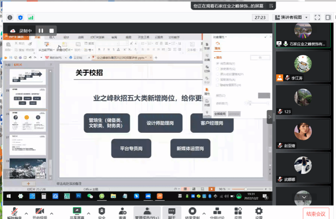 三场宣讲活动取得了圆满成功、参会人数包括校企合作单位工作人员、毕业学生、在校教师共参加人数658人、线上宣讲累计时长6小时、参会学生与公司互动频繁、19级环境设计、19级艺术设计、19级视觉传达专业等本科毕业班级学生参与积极性高且与用人单位就岗位问题、晋升问题、技能问题进行了全面的沟通与了解。