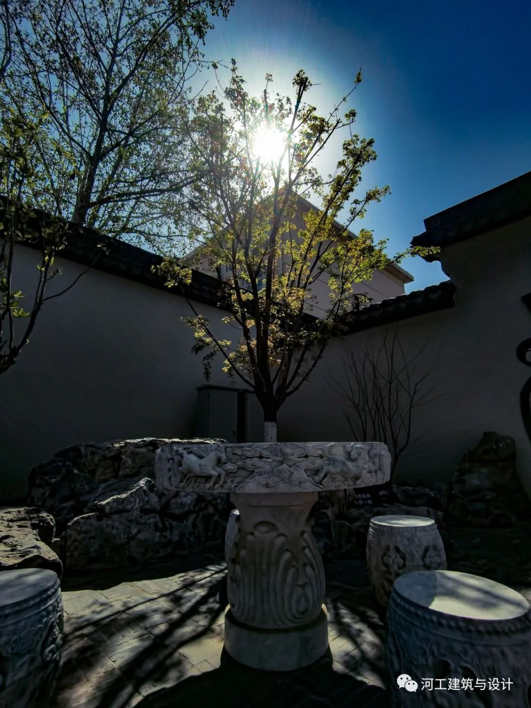 裕园做为藏在庄子里的苏式园林,溢满了徽式建筑独有的白墙灰瓦,充斥着仿佛闺秀般的柔美韵味。园子虽小却五脏俱全,构图巧妙雕刻精致的露景花窗,惟妙惟肖的守门石狮,充满玲珑巧致的亭廊,五蝙拜寿的园路铺装,漏瘦皱丑的奇石,体积较大的六角重檐攒尖顶亭等等。园中以小中见大,在有限的范围内运用,含蓄,扬抑,曲折,暗示等手法,来启动人的主观在创造,曲折有致,给人一种似乎深邃不尽的景境,仿佛扩大了游览者对于实际空间的无限感受,依水以水再造园中灵魂,给予游者清净淡雅之感。