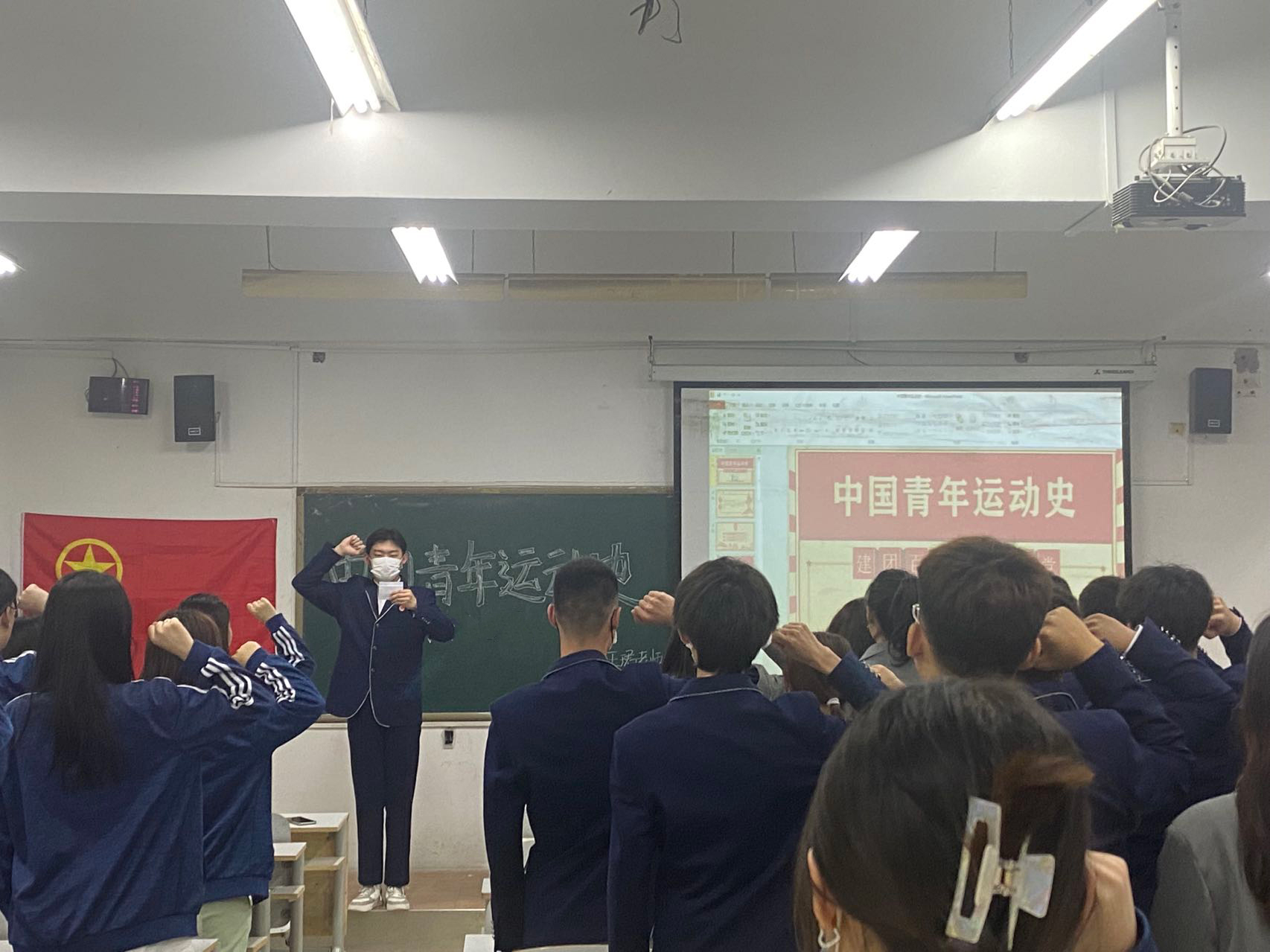 首先,我们进行了宣誓仪式;团员们面对鲜艳的中国共产主义青年团团旗,高举右手,紧握右拳,郑重地再次入团宣誓。“我志愿加入中国共产主义青年团,坚决拥护中国共产党的领导,遵守团的章程,执行团的决议,履行团员义务,严守团的纪律,勤奋学习,积极工作,吃苦在前,享受在后,为共产主义事业而奋斗!"铮铮誓词在室内回荡,每位团员胸佩团徽,表情庄严肃穆,誓词铿锵有力!