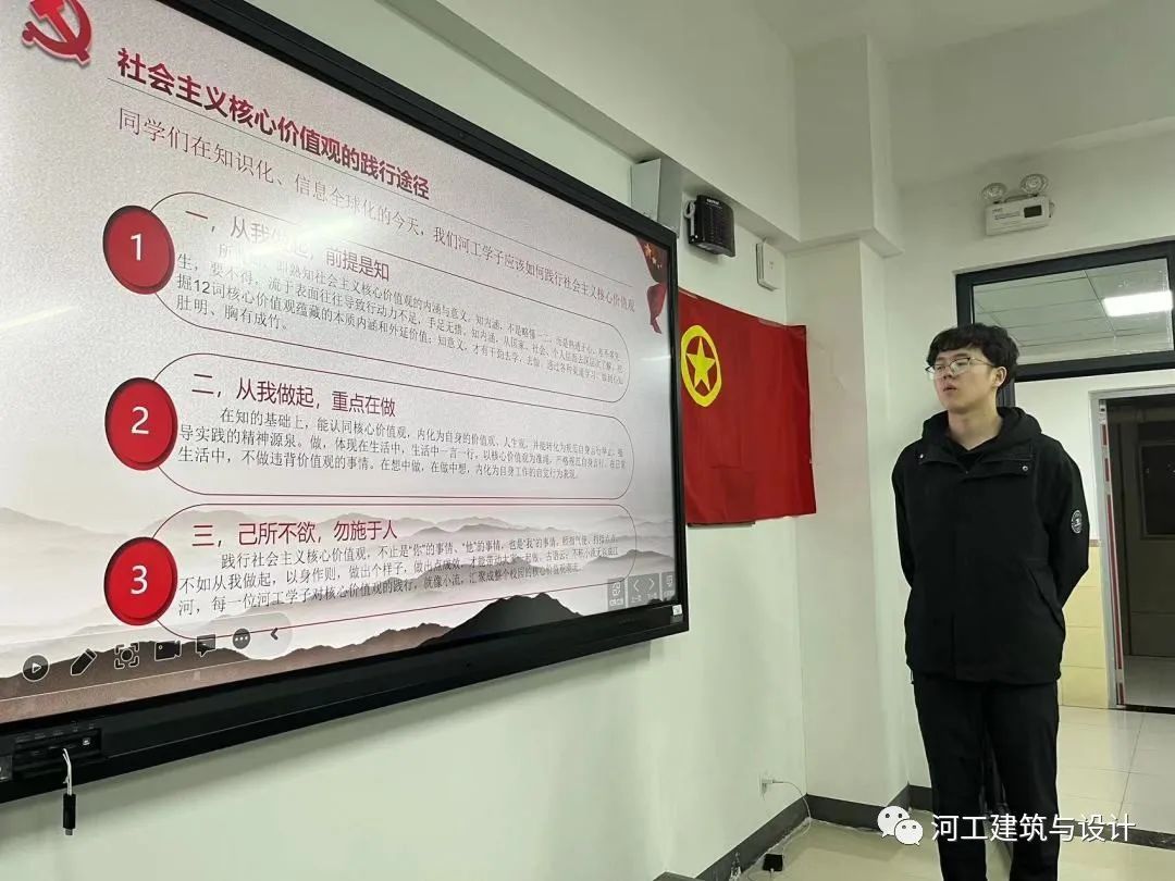 为了深入学习贯彻党的二十大精神,进一步加强大学生爱国主义教育,培育和践行社会主义核心价值观,鼓励广大学生坚定不移听党话,不忘初心跟党走,砥砺奋进,增长本领,为全面建设社会主义现代化国家贡献青春力量。特此,建筑与设计学院团务部于4月6日举办“践行社会主义核心价值观,争做时代新青年”的主题团课活动。
