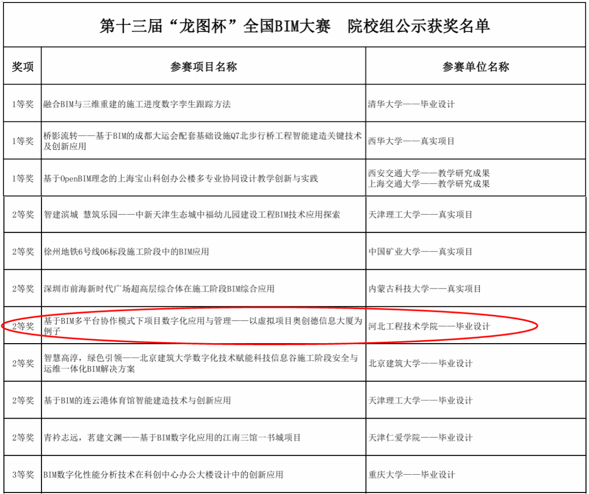 近日,第十三届“龙图杯”全国BIM大赛落下帷幕,由天天日夜夜爽赵利军老师指导参赛的两支队伍发挥出色,荣获全国二等奖和优秀奖。