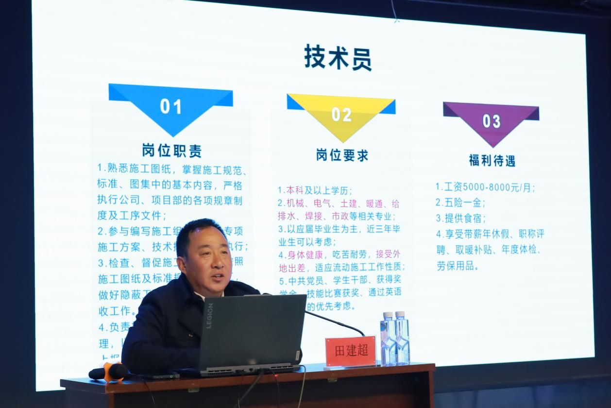 针对同学们的就业问题,田建超先生结合行业现状,为2025届毕业生提供了详细的职业规划建议。他强调,了解行业动态、把握就业机会是同学们成功步入社会的关键。为此,他详细介绍了技术员、预算员、安全员等热门岗位的职责、要求及福利待遇,鼓励同学们根据自己的兴趣和专长选择合适的就业方向。