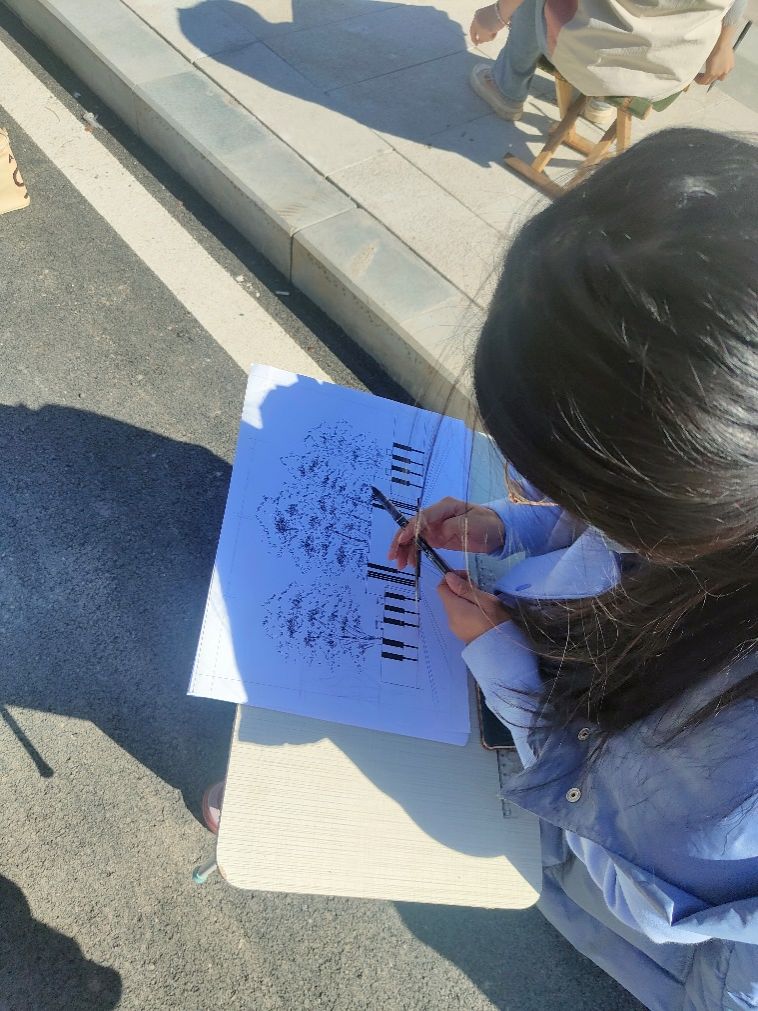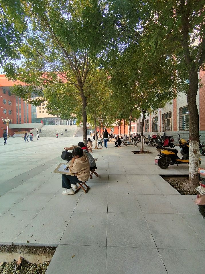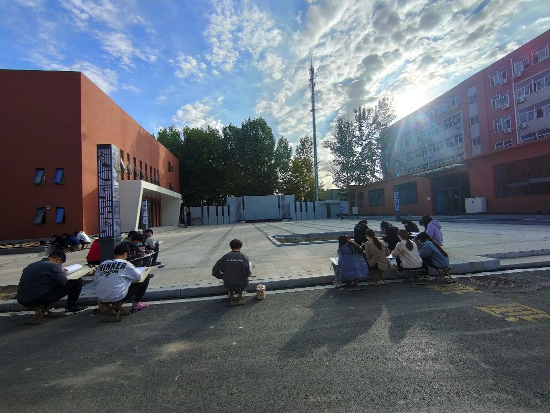 初秋的校园美丽又幽静,在暖暖的阳光沐浴下学生们完成了三天的风景写生实习,赵丽娜老师带领学生们走遍了学校各个美丽的角落。学生们分别选择了图书馆广场、7号宿舍楼小游园、食堂前广场和音乐景墙广场作为写实地点。