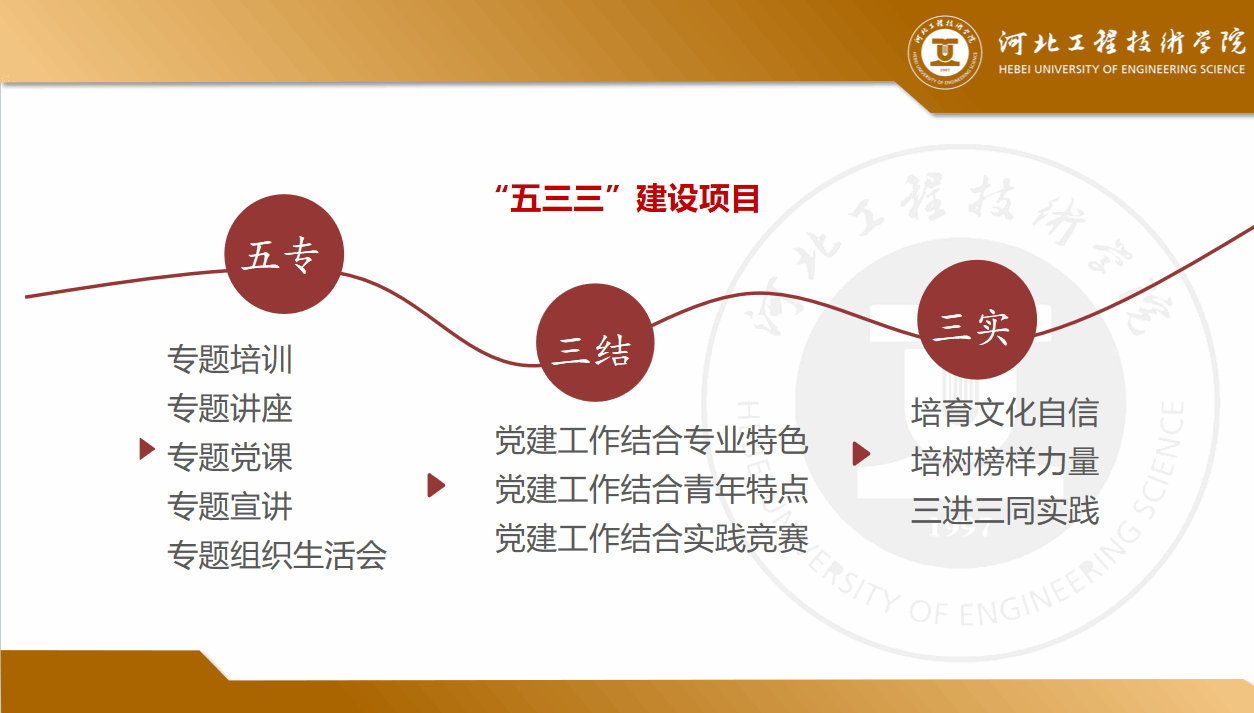 学院党总支深入学习贯彻习近平新时代中国特色社会主义思想和党的二十大精神,对照学校党委《“基层党建质量提升年”实施方案》、《关于基层党组织“规范化、标准化、特色化”建设的实施意见》等文件要求,以落实新时代党建总要求和新时代党的组织路线为主题,以加强基层支部建设和强化党员教育管理为主线,依托省级样板支部致力于提升基层党建工作质量,强学习,富载体,做表率,逐步在“双创”路上探索出了“五专题三结合三实践”建设项目。