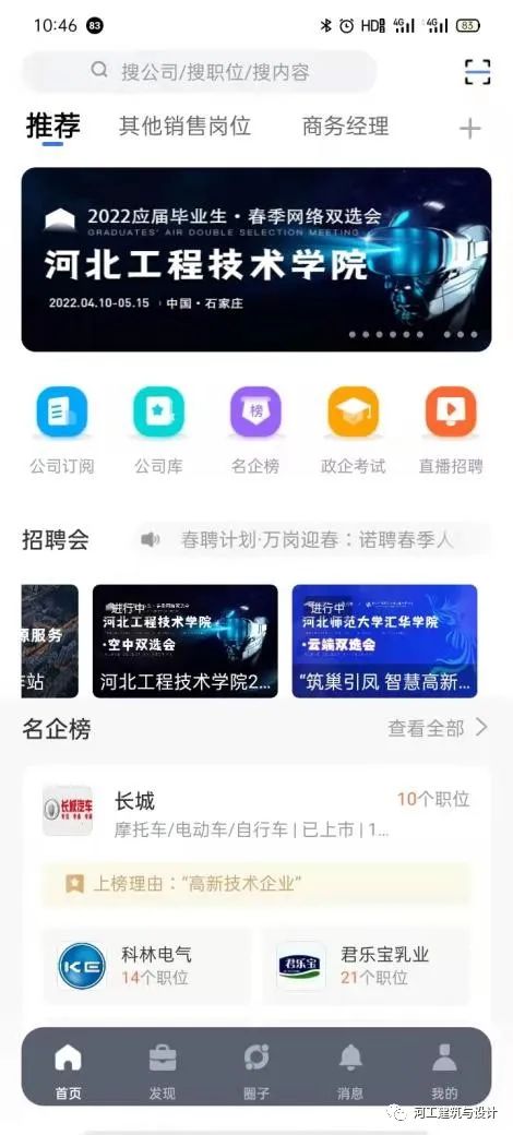 第四步:点击APP首页上部“河北工程技术学院2022届毕业生春季双选会”活动图,选择心仪的岗位投递简历吧。