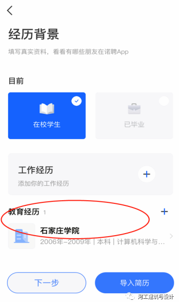 第三步:完善个人简历--个人信息、求职意向、教育经历等(简历完善的越完整越有助于找到心仪的工作呦),点击下一步--保存按钮,进入APP首页。